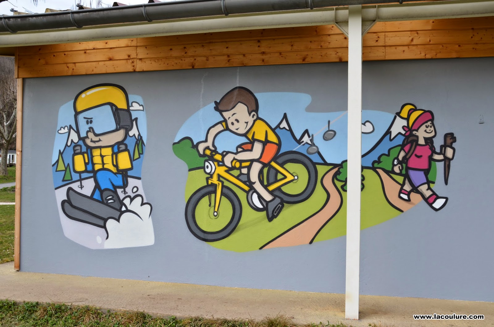 les graffitis ont été réalisés un peu de partout dans le camping et représentent les activités que l'on peut faire pendant ses vacances, autant en été qu'en hiver (proximité du vercors et des alpes !), le thème de la nature est aussi prédominant.